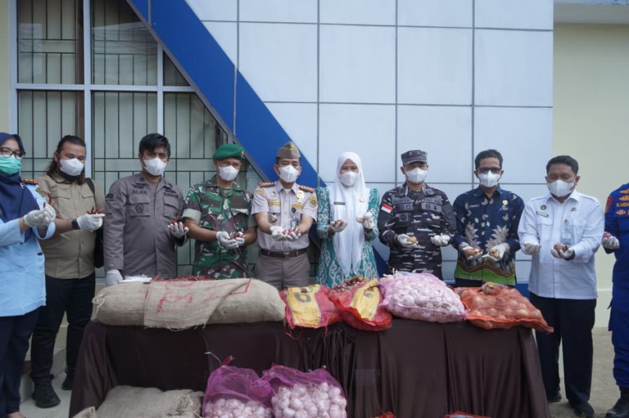Adapun komoditas yang dimusnahkan terdiri dari bawang merah sebanyak 1.115 karung besar seberat 22,3 ton dan 1.776 karung kecil seberat 17,76 ton, bawang bombai 356 karung seberat 3,56 ton, bawang putih 220 karung seberat 4,4 ton, serta cabai merah kering sebanyak 47 karung seberat 0,37 ton. Barang bukti tersebut sebelumnya diangkut menggunakan KM Anisa 89 tanpa dilengkapi dokumen karantina resmi, melanggar ketentuan perundang-undangan yang berlaku.