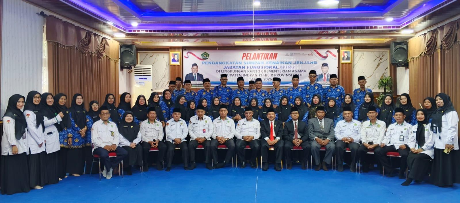 Sebanyak 38 guru di lingkungan Kementerian Agama (Kemenag) Kabupaten Indragiri Hilir telah resmi dilantik dalam prosesi khidmat yang digelar di Aula Mawar Kantor Kemenag Inhil, pada Senin (30/3/2026). Pelantikan ini merupakan bagian dari kenaikan jenjang jabatan fungsional guru untuk memperkuat kualitas pendidikan agama di wilayah Negeri Seribu Parit. Acara ini dipimpin oleh Kepala Kantor Wilayah (Kakanwil) Kemenag Riau, H. Muliardi, dan dihadiri oleh Kepala Kemenag Inhil H. Harun, pejabat struktural, kepala madrasah, pengawas, serta staf kepegawaian dan hukum.
