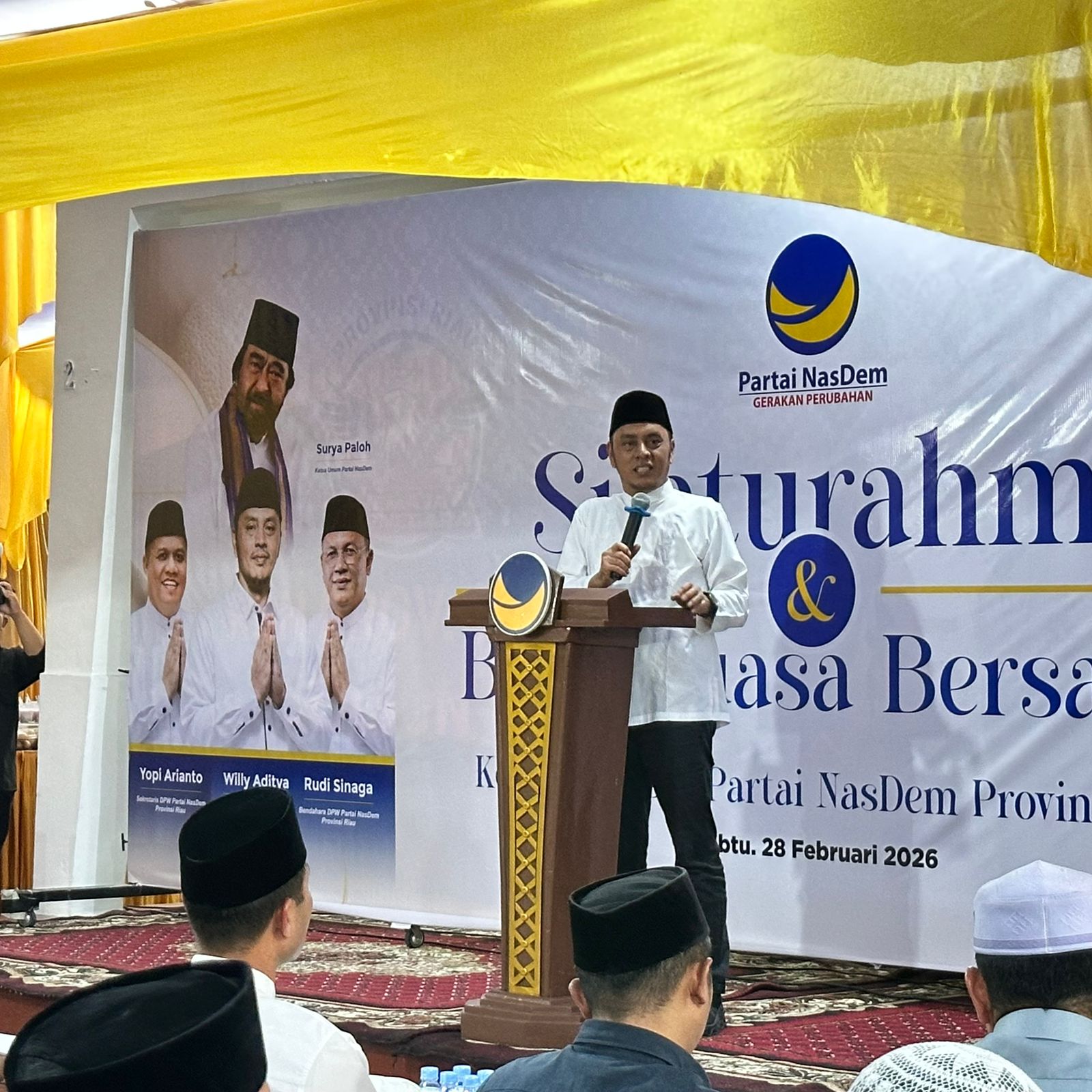 Ketua DPW NasDem Riau, Willy Aditya, menyinggung absennya Pelaksana tugas (Plt) Gubernur Riau, SF Haryanto, dalam undangan silaturahmi dan buka puasa bersama di Kantor DPW NasDem Riau, Jalan Diponegoro Pekanbaru, pada Sabtu (28/2/2026). Sindiran tersebut disampaikan dalam pidato di hadapan sejumlah pejabat yang hadir, termasuk Bupati Siak Afni, Wakil Bupati Rohil Jhonny Charles, Wakil Bupati Bengkalis Bagus Santoso, dan senator Arif Eka Putra.