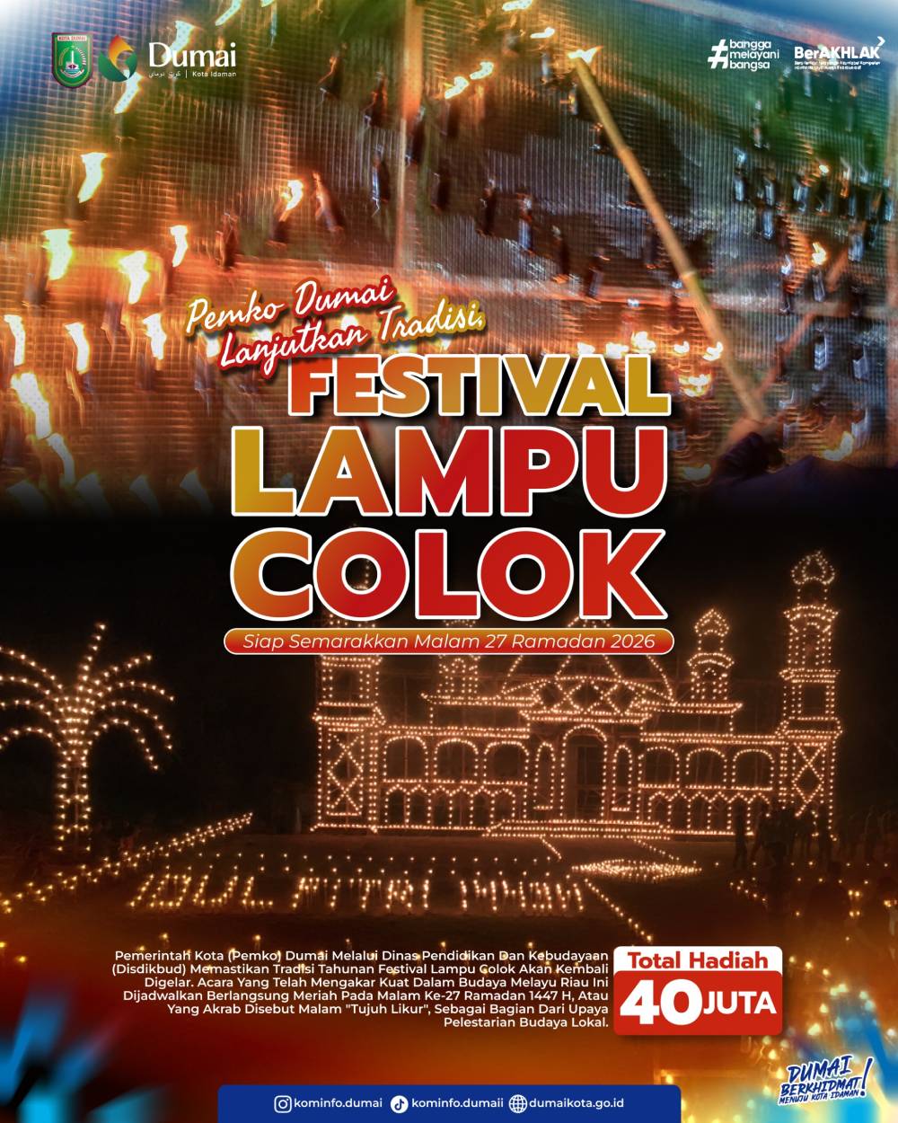 Pemerintah Kota Dumai melalui Dinas Pendidikan dan Kebudayaan (Disdikbud) telah memastikan bahwa Festival Lampu Colok akan kembali diselenggarakan pada malam ke-27 Ramadan 1447 H, yang dikenal sebagai malam “tujuh likur”. Festival ini merupakan bagian dari upaya pelestarian budaya Melayu Riau yang telah menjadi tradisi tahunan yang kuat di masyarakat.