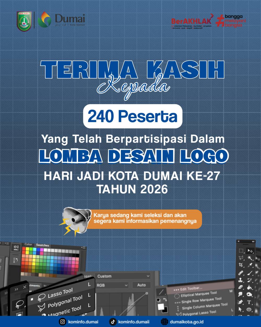 Lomba desain logo untuk peringatan Hari Jadi ke-27 Kota Dumai telah resmi ditutup pada Selasa (3/3/2026) pukul 23.59 WIB. Sebanyak 240 karya desain dari berbagai daerah di Indonesia telah diterima panitia dan saat ini sedang dalam tahap penilaian oleh tim juri.