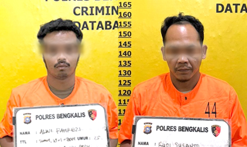 Satuan Reserse Kriminal Polres Bengkalis berhasil menangkap dua orang terduga pelaku illegal logging, yaitu AF (25) dan RS (38). Penangkapan terhadap keduanya dilakukan pada Senin (9/3/2026) di Jalan Sumitro, Dusun Sena, Desa Sungai Linau, Kecamatan Siak Kecil. AF ditangkap sekitar pukul 23.00 WIB dengan barang bukti berupa truk Colt Diesel BM 9139 SE yang bermuatan kayu olahan sekitar 5 kubik dan 1 unit handphone merek Vivo warna putih. Sementara itu, RS diamankan tiga puluh menit kemudian dengan barang bukti truk Colt Diesel BK 8187 AC yang bermuatan kayu olahan sekitar 4 kubik, serta 1 unit handphone merek Vivo warna hitam.