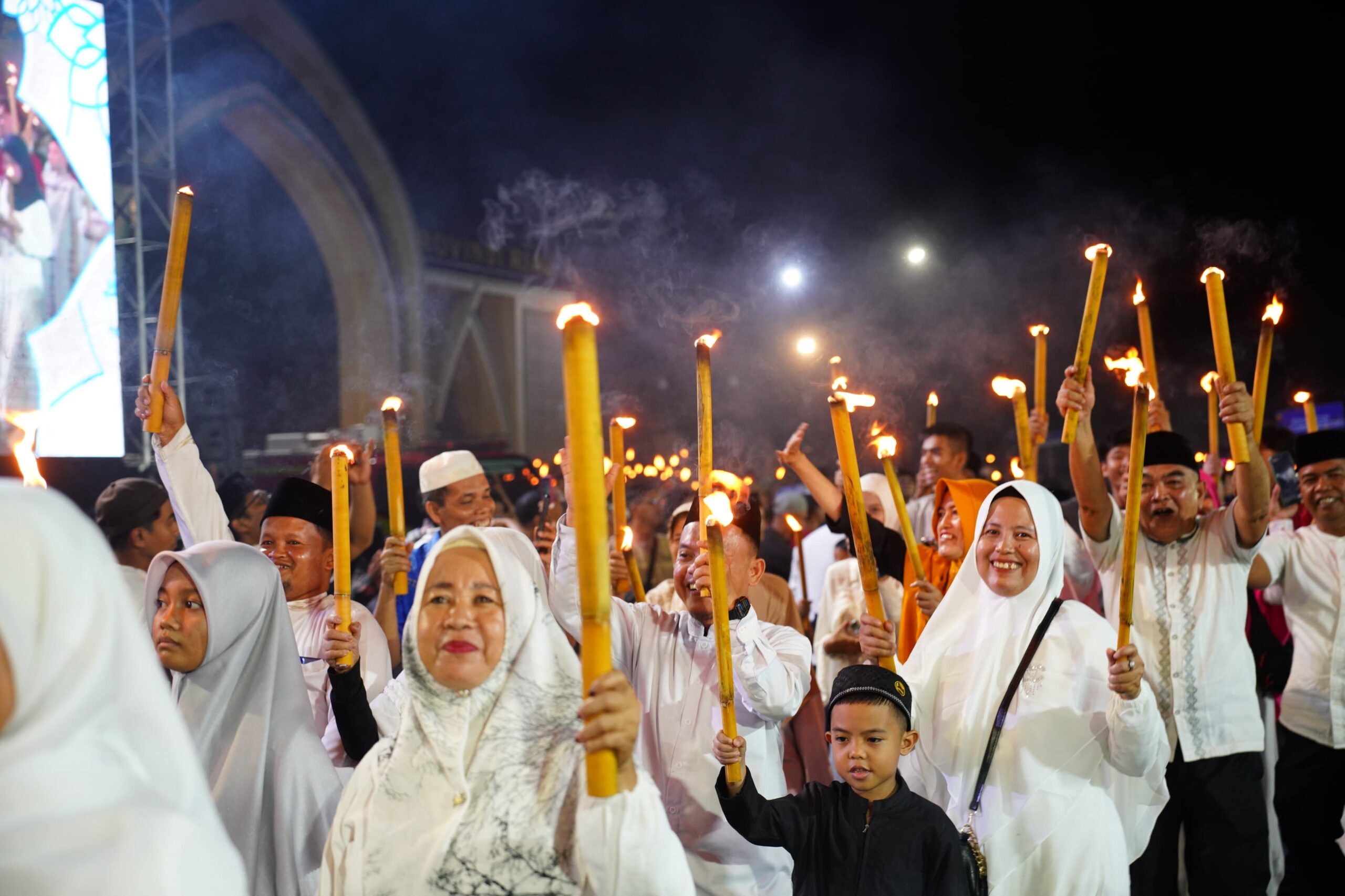 Suasana malam takbiran terasa semakin khidmat sekaligus semarak dengan gema takbir yang bersahut-sahutan. Cahaya obor yang dibawa peserta pawai menciptakan nuansa hangat dan religius, menambah kesan sakral di malam kemenangan. Rute pawai yang mengelilingi kawasan Masjid Raya An-Nur menjadi pusat perhatian. Berbagai atraksi ditampilkan, mulai dari mobil hias dengan miniatur masjid hingga dekorasi kreatif yang memukau dan mengundang tepuk tangan warga.