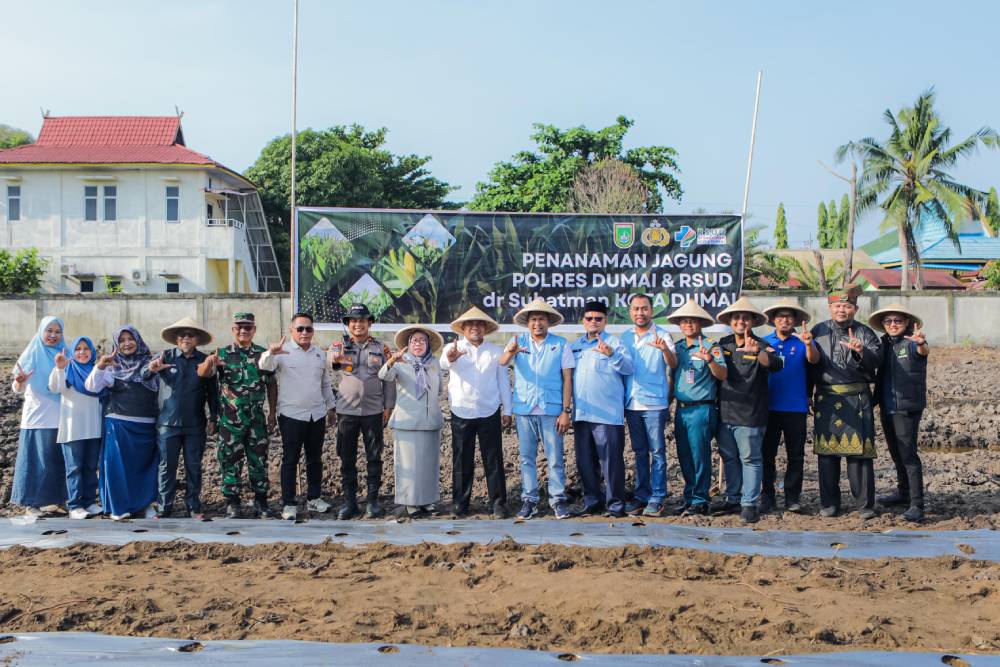 Wakil Wali Kota Dumai, Sugiyarto, mengambil bagian dalam kegiatan penanaman bibit jagung sebagai bagian dari program green policing di lingkungan RSUD dr. Suhatman, Kamis (30/4/2026). Kegiatan ini merupakan kolaborasi antara kepolisian dan pihak rumah sakit dalam mendorong ketahanan pangan sekaligus penghijauan lingkungan melalui pemanfaatan lahan kosong secara produktif.
